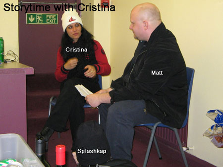 Splashkap: (kneeling on the floor like a kid listening to a story being read) It’s story time with Cristina!